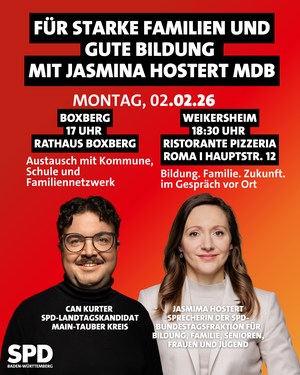 Besonders freue ich mich, Jasmina Hostert, Mitglied des Deutschen Bundestages und Sprecherin der SPD-Bundestagsfraktion für Bildung, Familie, Senioren, Frauen und Jugend, bei beiden Terminen dabei zu haben. Sie bringt wichtige bundespolitische Perspektiven mit und diskutiert gleichzeitig praxisnah vor Ort. Als Gastgeber und Kandidat liegt mir besonders am Herzen, dass Erfahrungen aus Boxberg und Weikersheim in die politische Arbeit einfließen.