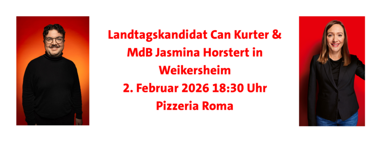 Im Anschluss lädt die SPD Orts- und Kreispartei zu einer öffentlichen Diskussion in Weikersheim ein. Gemeinsam mit Bürgerinnen und Bürgern wollen wir über Bildung, Familie, Frauen, Senioren und Jugend sprechen, lokale Herausforderungen beleuchten und Lösungen diskutieren.